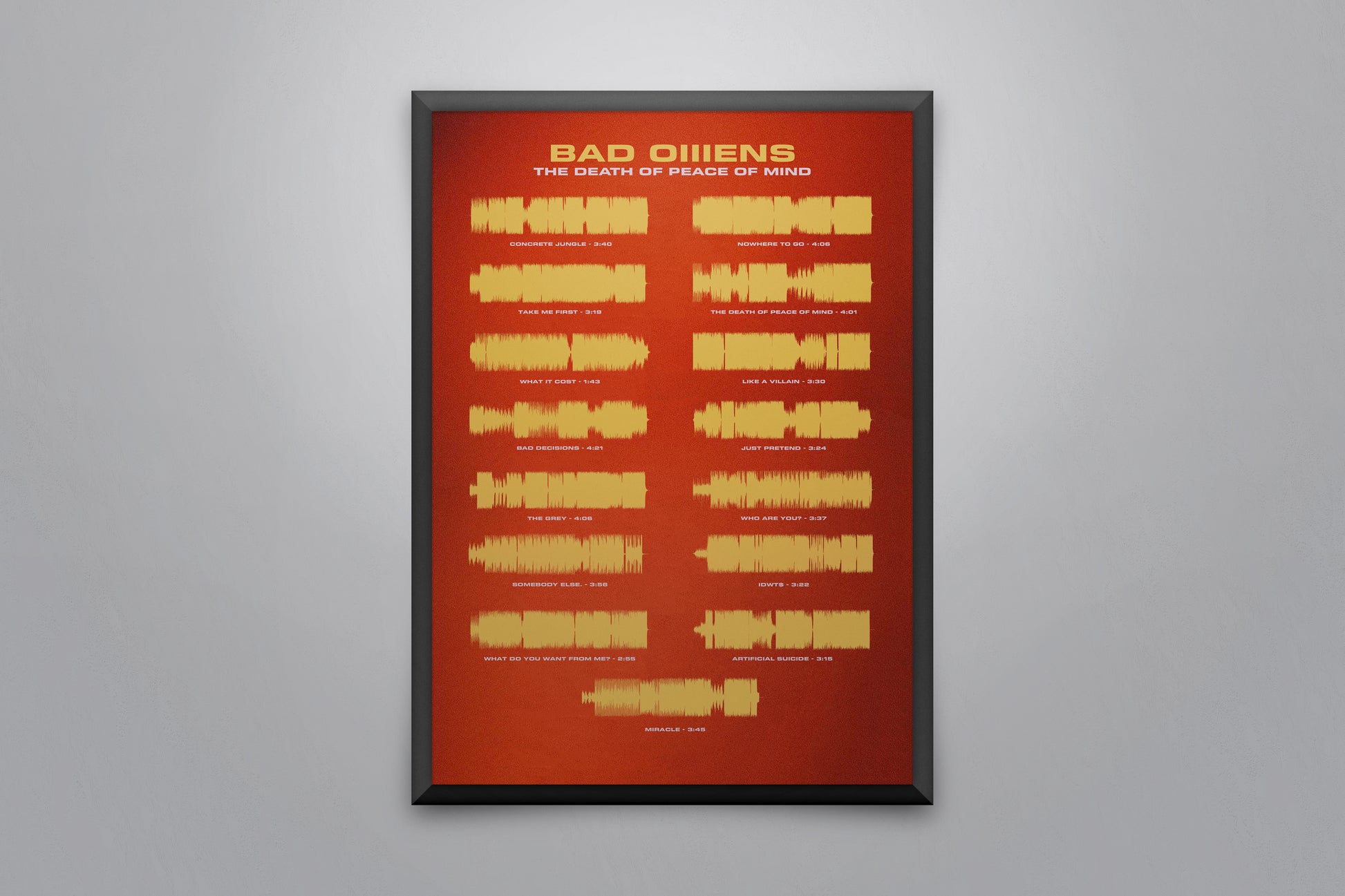 Soundwave poster displaying every song on the album 'THE DEATH OF PEACE OF MIND' by Bad Omens.