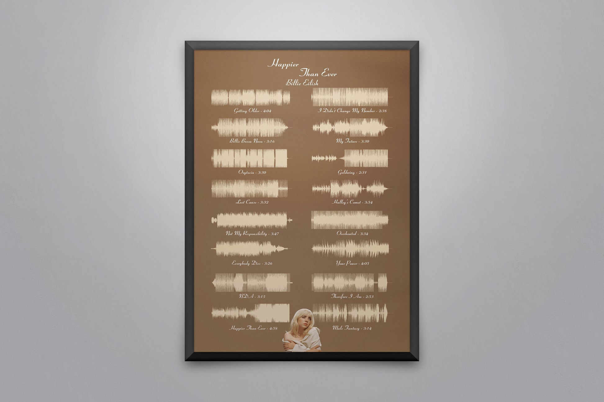 Soundwave poster displaying every song on the album 'Happier Than Ever' by Billie Eilish.