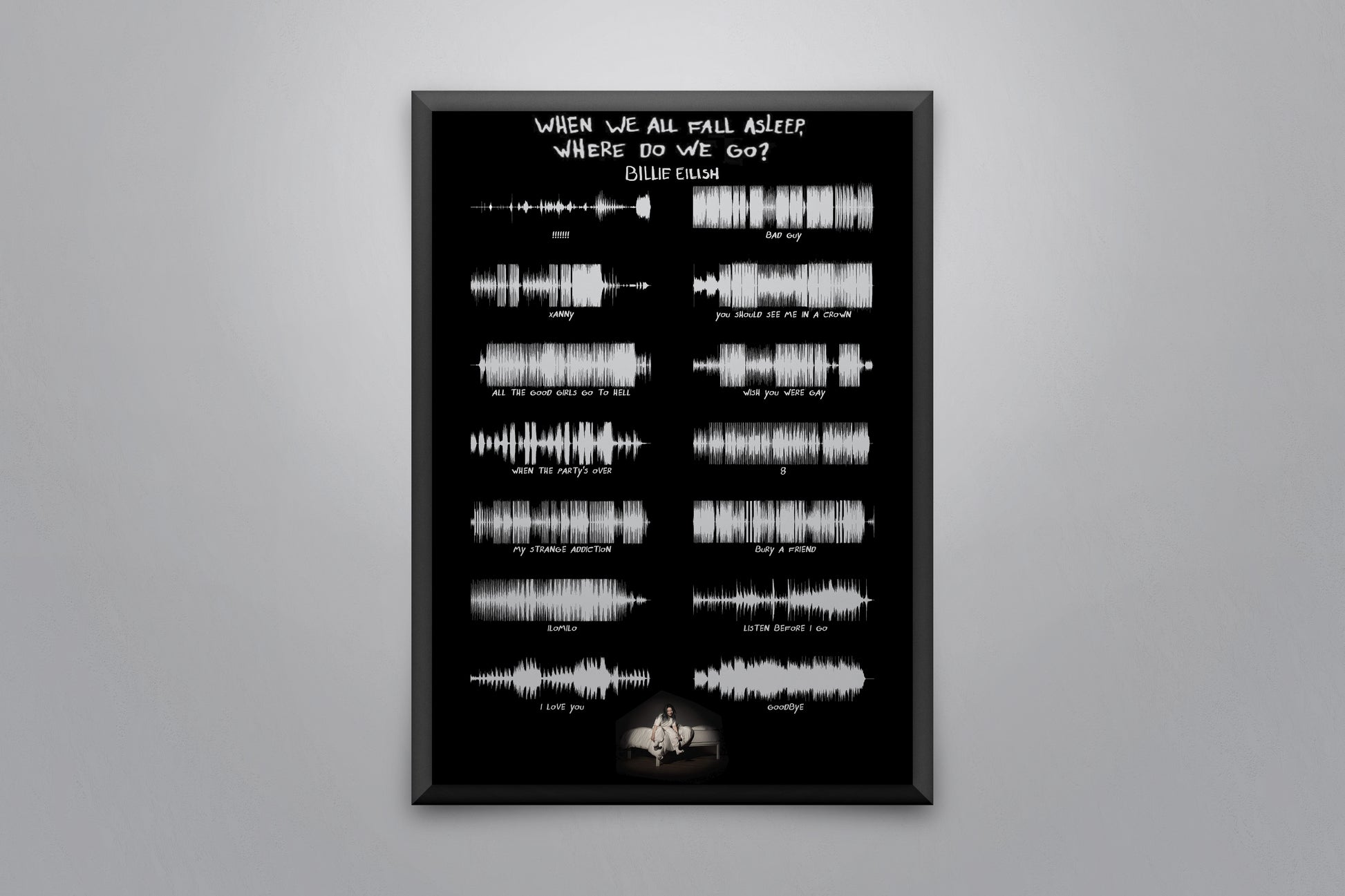 Soundwave poster displaying every song on the album 'WHEN WE ALL FALL ASLEEP, WHERE DO WE GO?' by Billie Eilish.