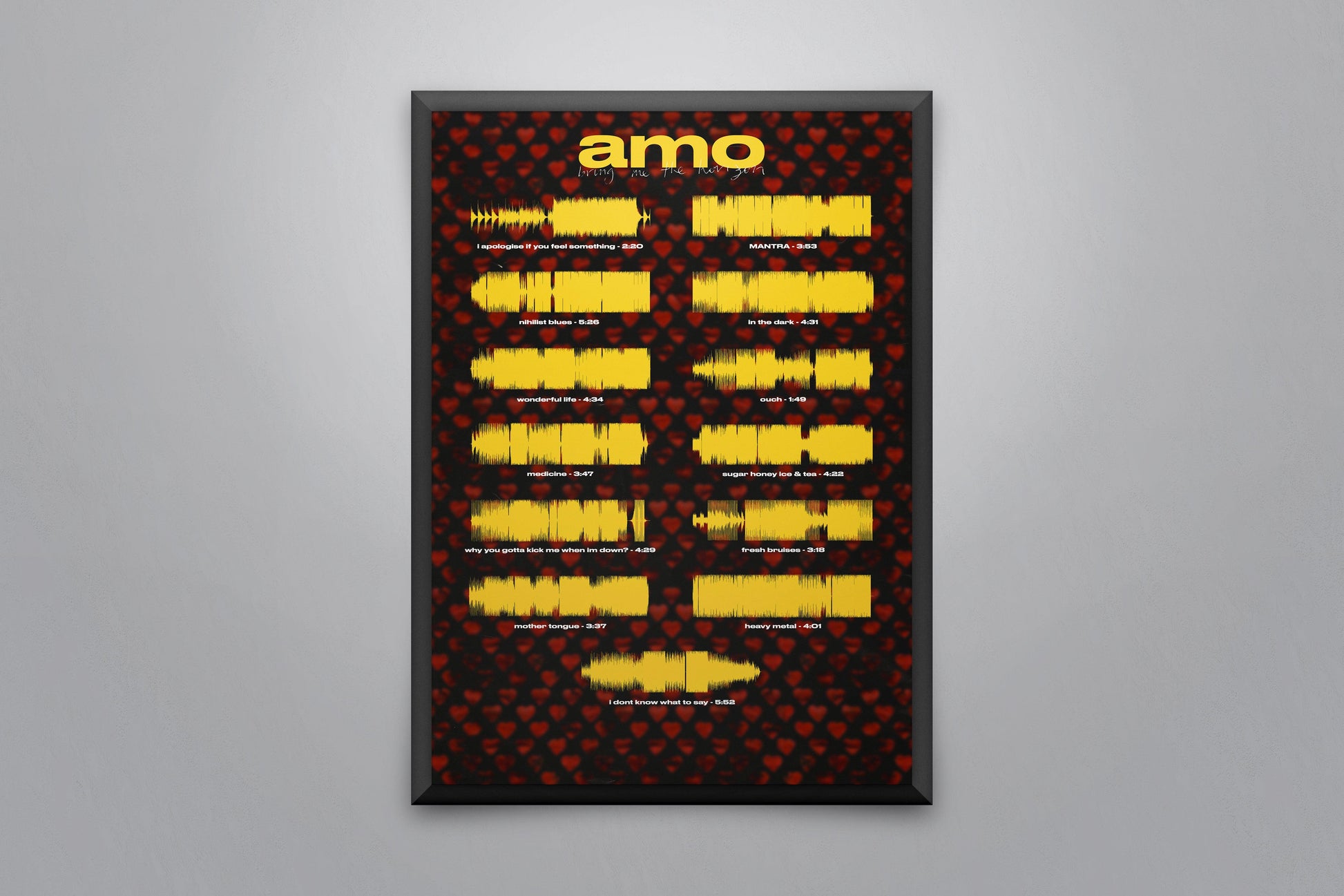 Soundwave poster displaying every song on the album 'amo' by Bring Me The Horizon.