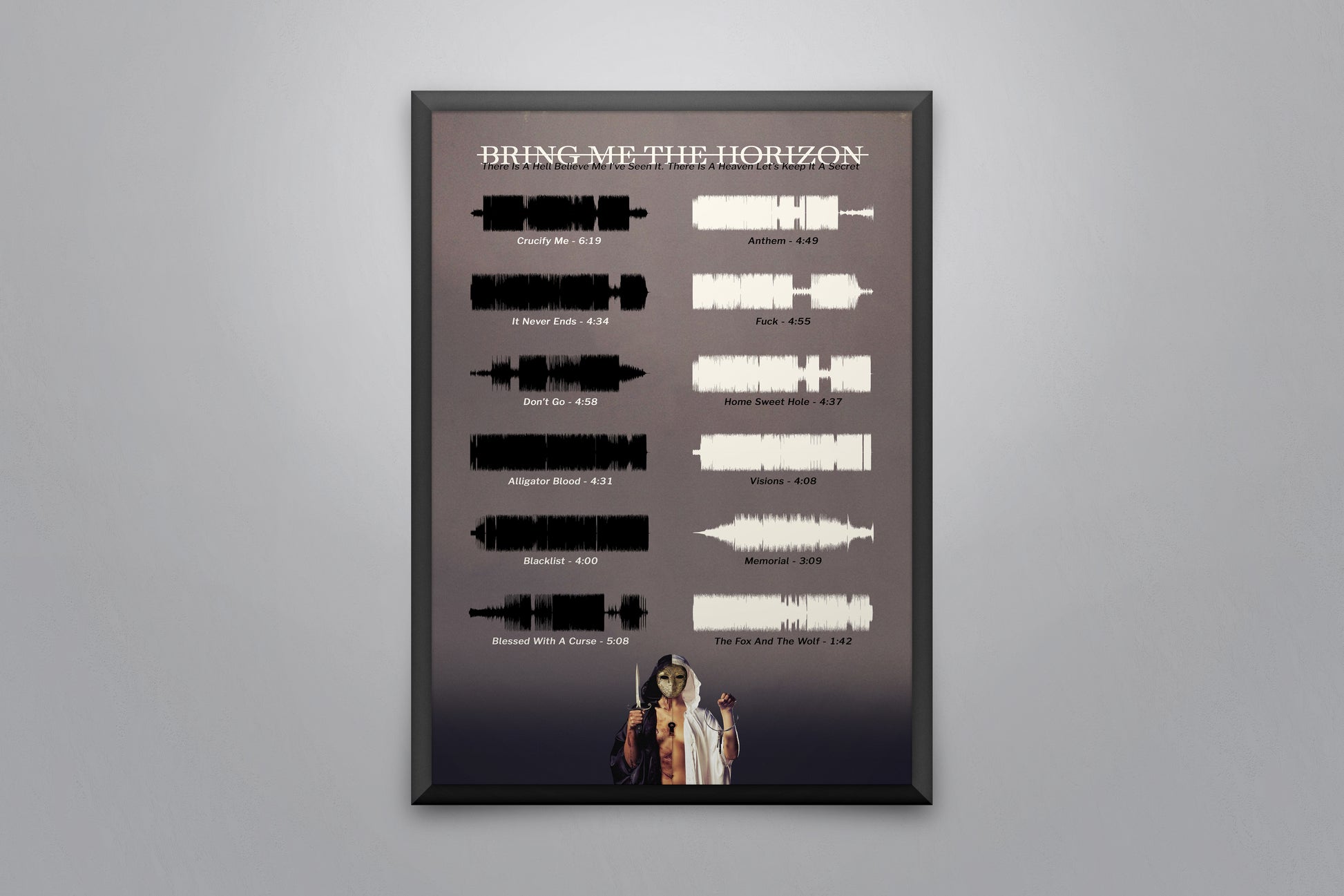 Soundwave poster displaying every song on the album 'There Is A Hell Believe Me I've Seen It. There Is a Heaven Let's Keep It A Secret' by Bring Me The Horizon.
