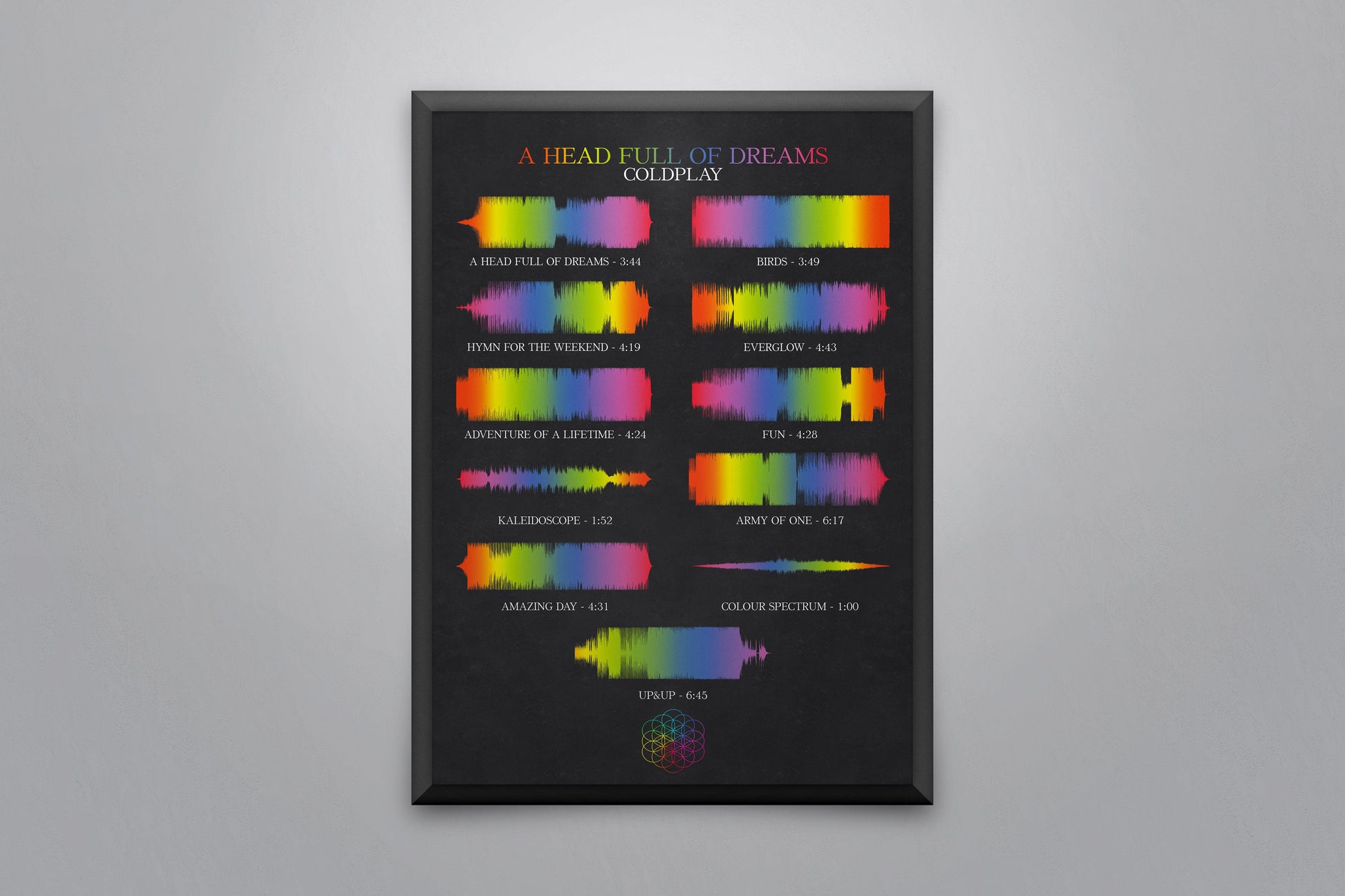 Soundwave poster displaying every song on the album 'A Head Full of Dreams' by Coldplay.