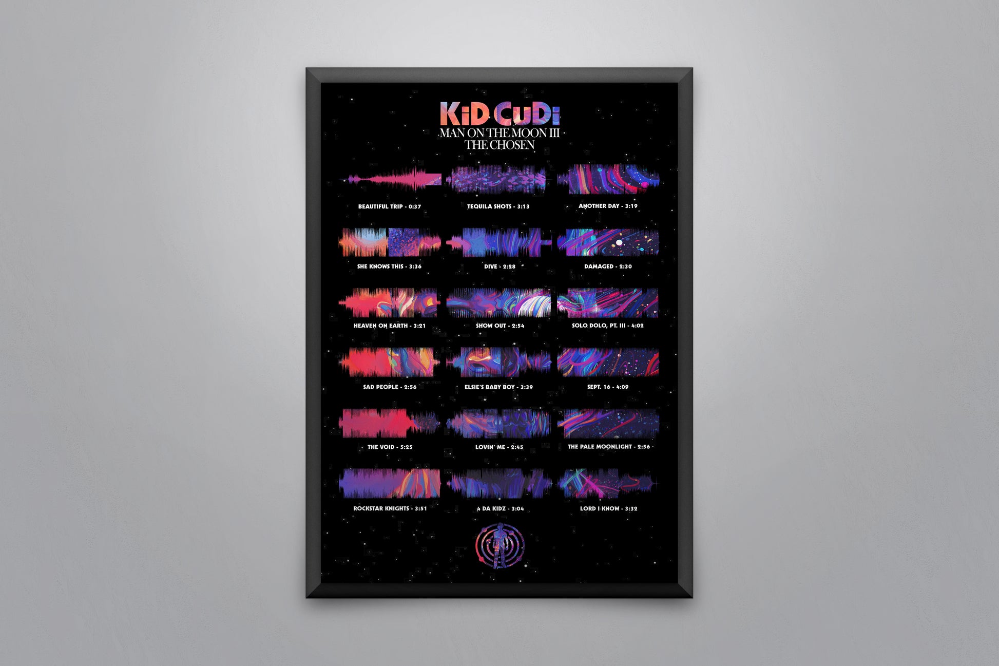 Soundwave poster displaying every song on the album 'Man On The Moon III: The Chosen' by Kid Cudi.