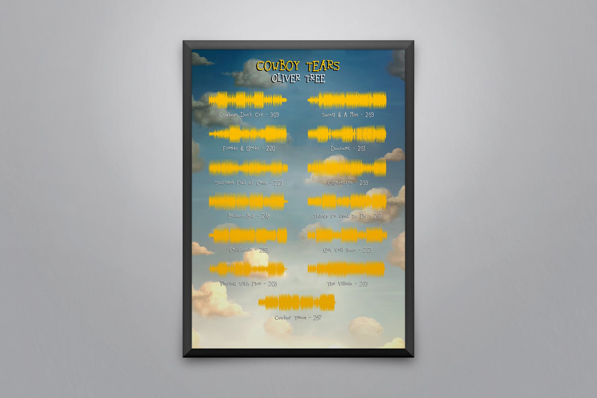 Soundwave poster displaying every song on the album 'Cowboy Tears' by Oliver Tree.