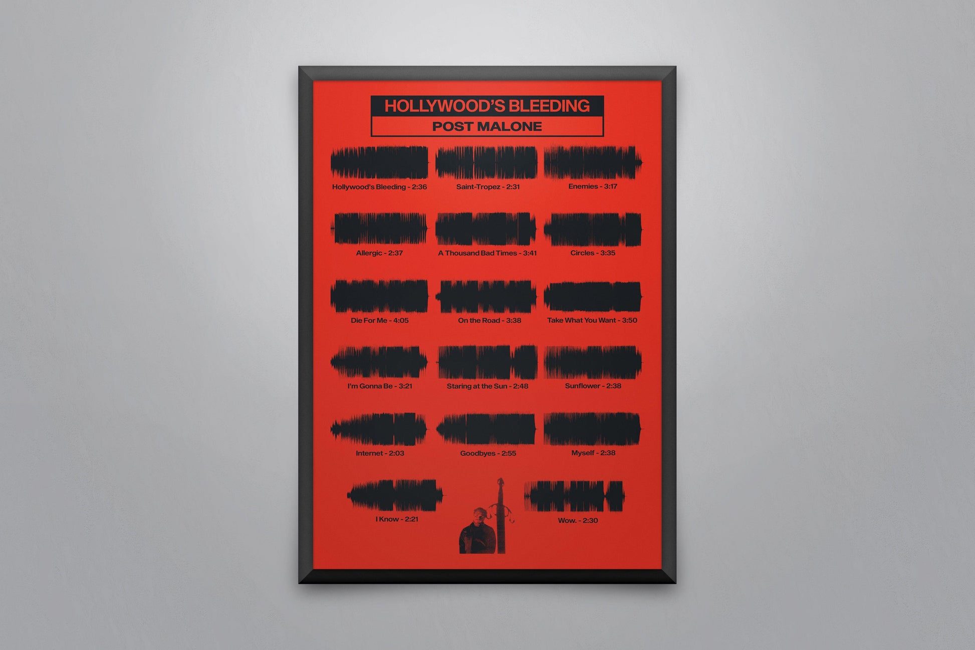 Soundwave poster displaying every song on the album 'Hollywood's Bleeding' by Post Malone.