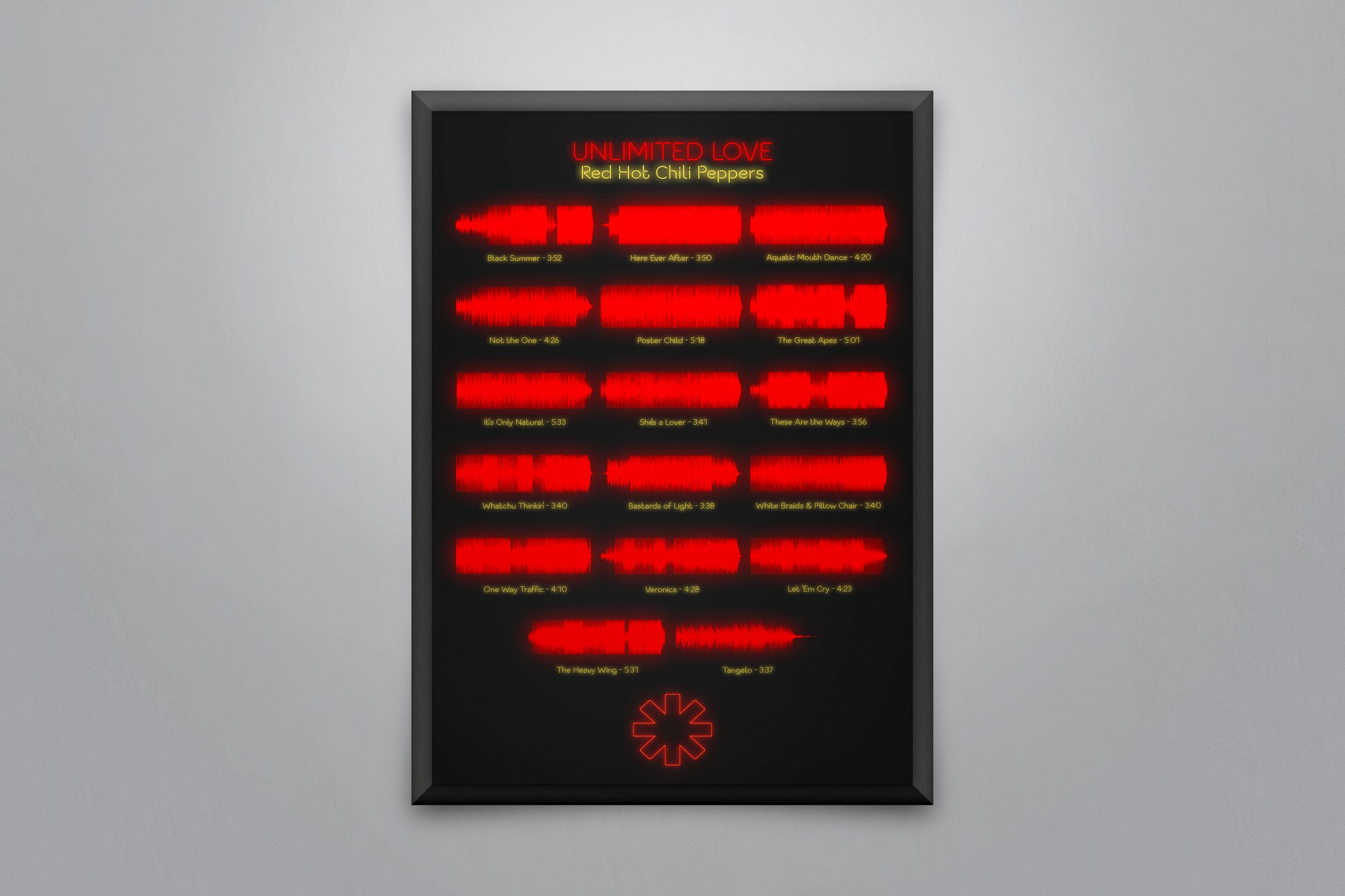 Soundwave poster displaying every song on the album 'Unlimited Love' by Red Hot Chili Peppers.
