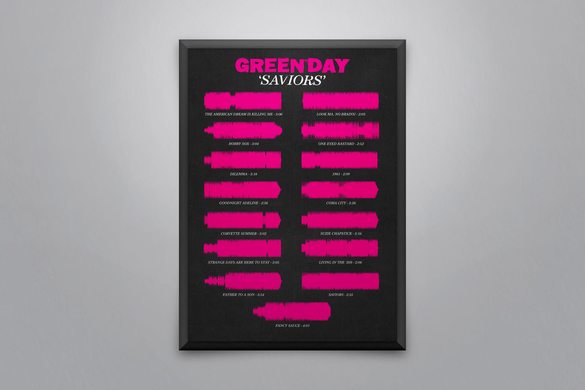 Soundwave poster displaying every song on the album 'Saviors' by Green Day.