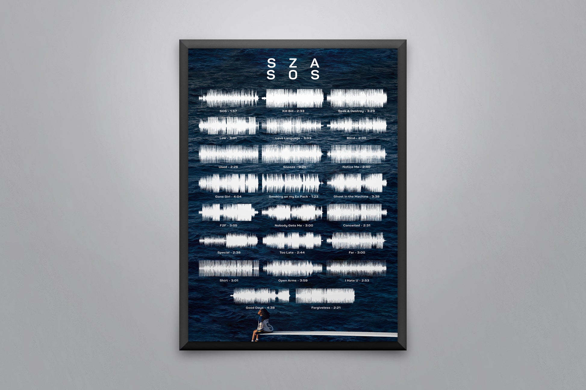 Soundwave poster displaying every song on the album 'SOS' by SZA.