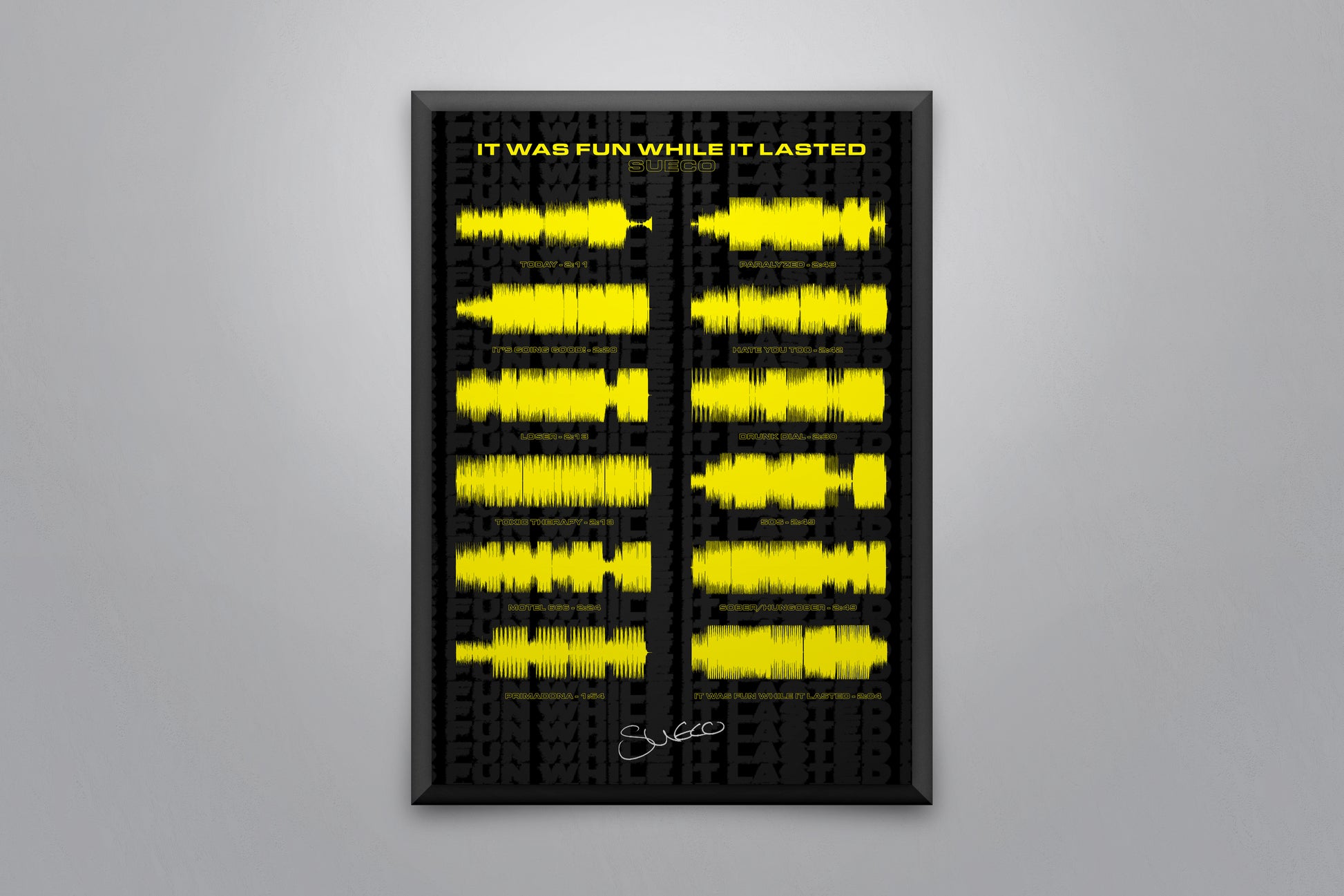 Soundwave poster displaying every song on the album 'It Was Fun While It Lasted' by Sue.