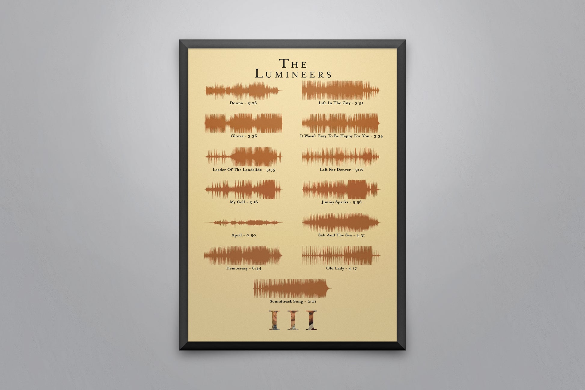 Soundwave poster displaying every song on the album 'III' by The Lumineers.