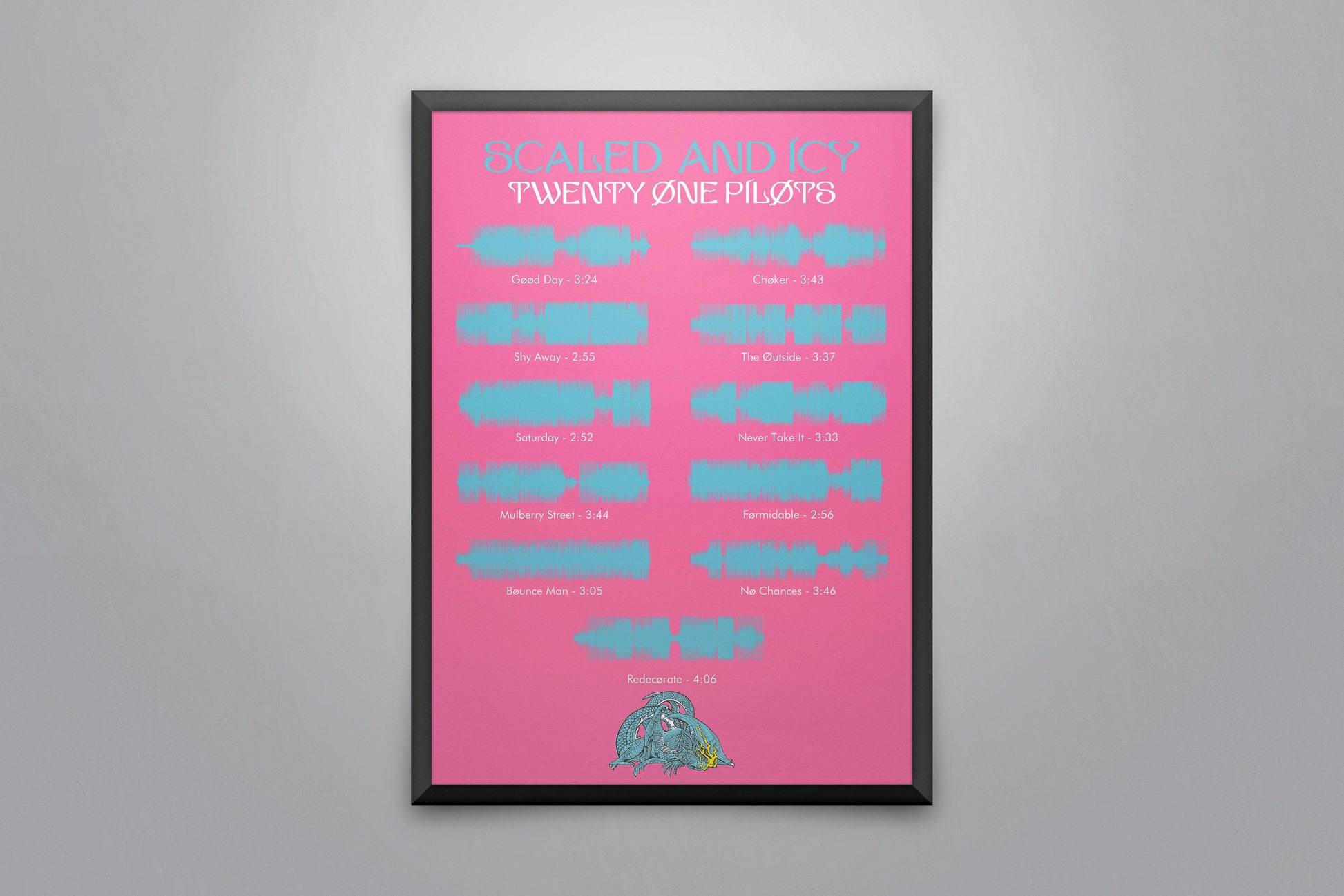 Soundwave poster displaying every song on the album 'Scaled And Icy' by twenty one pilots.